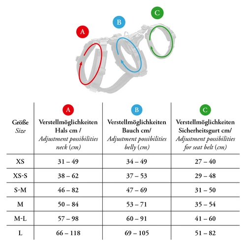 | Größe | Verstellmöglichkeiten (Hals) | Verstellmöglichkeiten (Bauch) | Breite der Gurte |