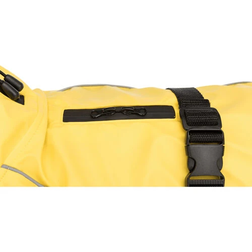 Mit diesem Regenmantel werden Sie und Ihr treuer Vierbeiner jedes Wetter überstehen. Der Regenmantel ist aus Polyurethan/Polyester und hat zwei wasserdichte Reißverschlüsse in der Nähe des Halses, so dass Sie ihn leicht am Halsband oder Geschirr befestigen können. Außerdem ist dieser Hunderegenmantel komplett winddicht und hat reflektierende Elemente, damit Ihr Vierbeiner auch im Dunkeln wahrgenommen wird. Der Bauchgurt mit Schnalle ist stufenlos verstellbar, ebenso wie die Beinschlaufen für die Hinterbeine. Ein extra hoher Kragen mit Kordelzug und ein pflegeleichtes Futter vervollständigen diesen praktischen Regenmantel für Hunde.